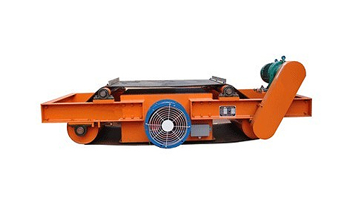 RCDC型风冷电磁除铁机,是在RCDA系列除铁机的基础上增加了驱动电机、滚筒、带刮板的卸铁胶带等组成的卸铁机构。在工作过程中卸铁机构自动将卸铁皮带吸附的铁磁性物质卸到集铁箱内,无需停电人工清理,实现了除铁自动化。二、示意图