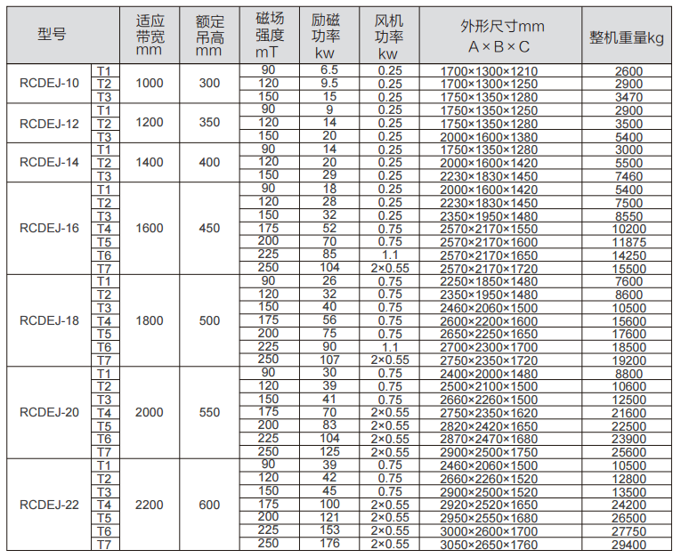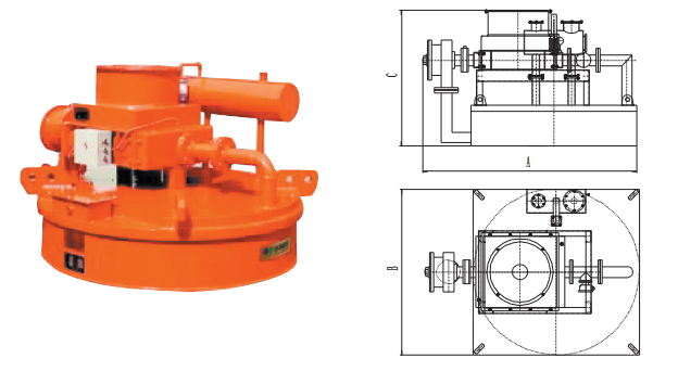 RCDEJ型强迫油循环电磁吸盘适用于输煤港口、大型火电厂、煤矿等对除铁要求特别高的场所。用于悬挂在大型输送皮带上方,能有效清除煤中雷管炮线等细小铁件,对清除杂铁,提高物料品位起到重要的作用,可在粉尘、潮湿、盐雾腐蚀严重的恶劣环境下运行。二、示意图
