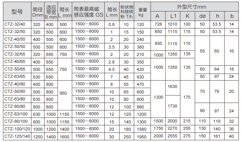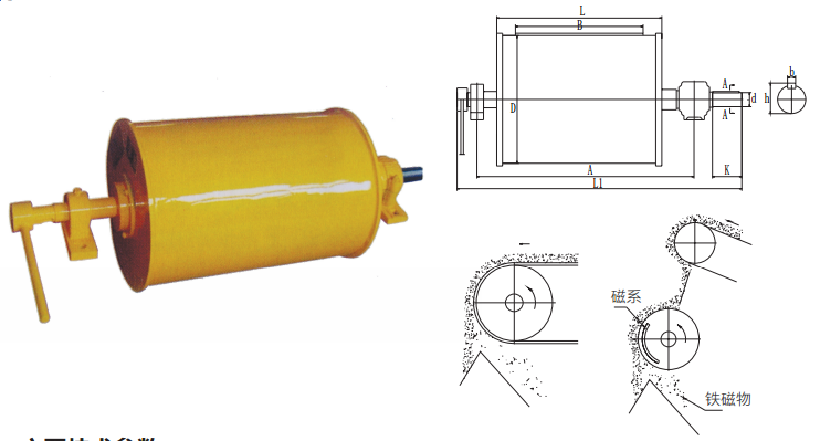 CTZ型中场强半磁滚筒(CTZ型中场强全磁滚筒结构与RCT型参数等同),多用于对粉状、颗粒状、小块状物料的净化处理,或对铁质的回收利用,对防止破碎机、研磨机、压榨机的破坏和磨损起着可靠的保护作用。它安装方便、吸力强、无能耗、连续工作、操作简单。根据TD-75型带式输送机标准设计,能满足广大用户对高场强、大深度除铁的使用要求。广泛应用于冶金、陶瓷、磨料、磨具、金刚砂、非金属矿、耐火材料、矿山、食品、化工、玻璃、建材等行业。二、示意图