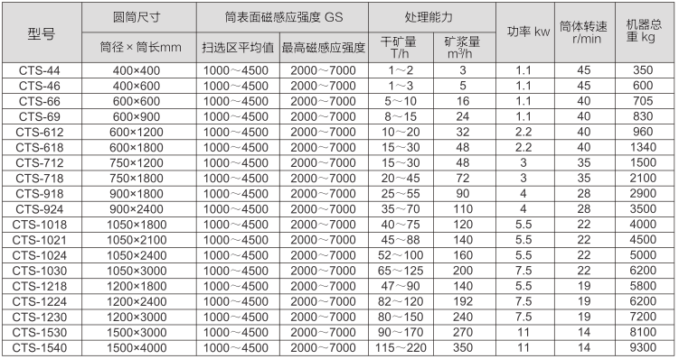 CTS型顺流湿式预选机适用于湿式选别矿石粒度为6~0mm的较粗粒度强磁性物料的预选和精选,或者除去非磁性矿物中混杂的强磁性矿物。本机可以连续给矿和排矿,磁场强度大,磁场梯度高,工作间隙大,具有较高的处理能力。亦可多台串连工作。