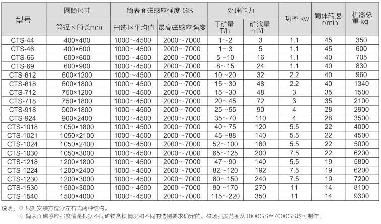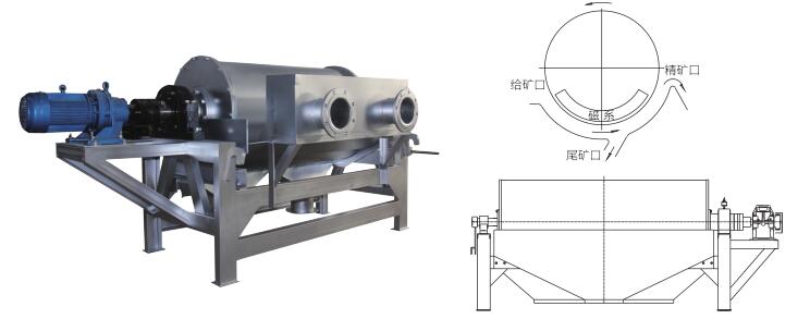 CTS型湿法顺流式磁分离机用于化工等行业溶液分离出混合在其中的细粒级铁磁性物质。如工艺要求添加的作为絮凝介质的磁粉与液体分离,重复利用的磁粉回收等。尤其适用于大流量、高浓度,磁性物含量高的液体分离处理。本机可以连续全自动工作,具有较高的处理能力。顺流式槽体结构主要针对不允许二次加水作为辅助介质的液体中分离磁性物质。其原理是当液体自较高位置的入料口自然流入设备磁场区,其中强磁性矿物被吸附在圆筒表面,液体自流状态从较低的出料口流出,而吸附在圆筒表面上的磁性矿物随圆筒旋转,被带出磁场区,用刮板刮除或原液冲入磁性物槽中,完成分选作业。二、示意图