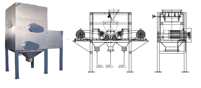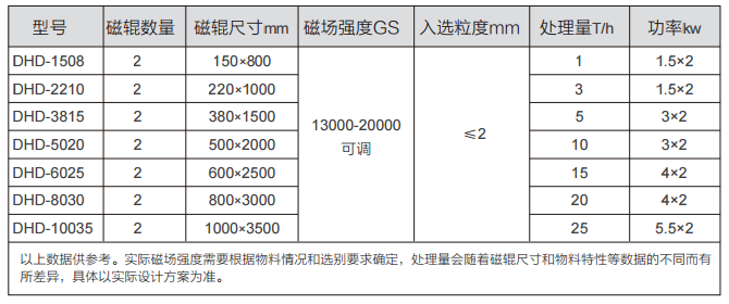 DHD型对辊式自动磁分离机是我公司经多年市场经验独立研发的一种新型干选设备,其磁系经过特殊设计、属于永磁局部半闭合磁系结构;磁感应强度大并且可在13000GS~20000GS范围内进行调节。将物料均匀的送到磁选区域后,在设备的磁选区受到重力和磁场力的作用下,利用物料的磁性差异有不同的运动轨迹实现分离,磁性矿物被吸附在磁辊表面旋转到达精矿区,毛刷将吸附在磁辊表面上的磁性矿刷脱。该机对粉矿率较少但又均匀的中小颗粒状矿石分选效果卓越,生产效率高,操作简单方便。适用于硅粉、石英石、锆石、长石等细粒级的非磁性矿石去除磁性物提纯作业。二、示意图